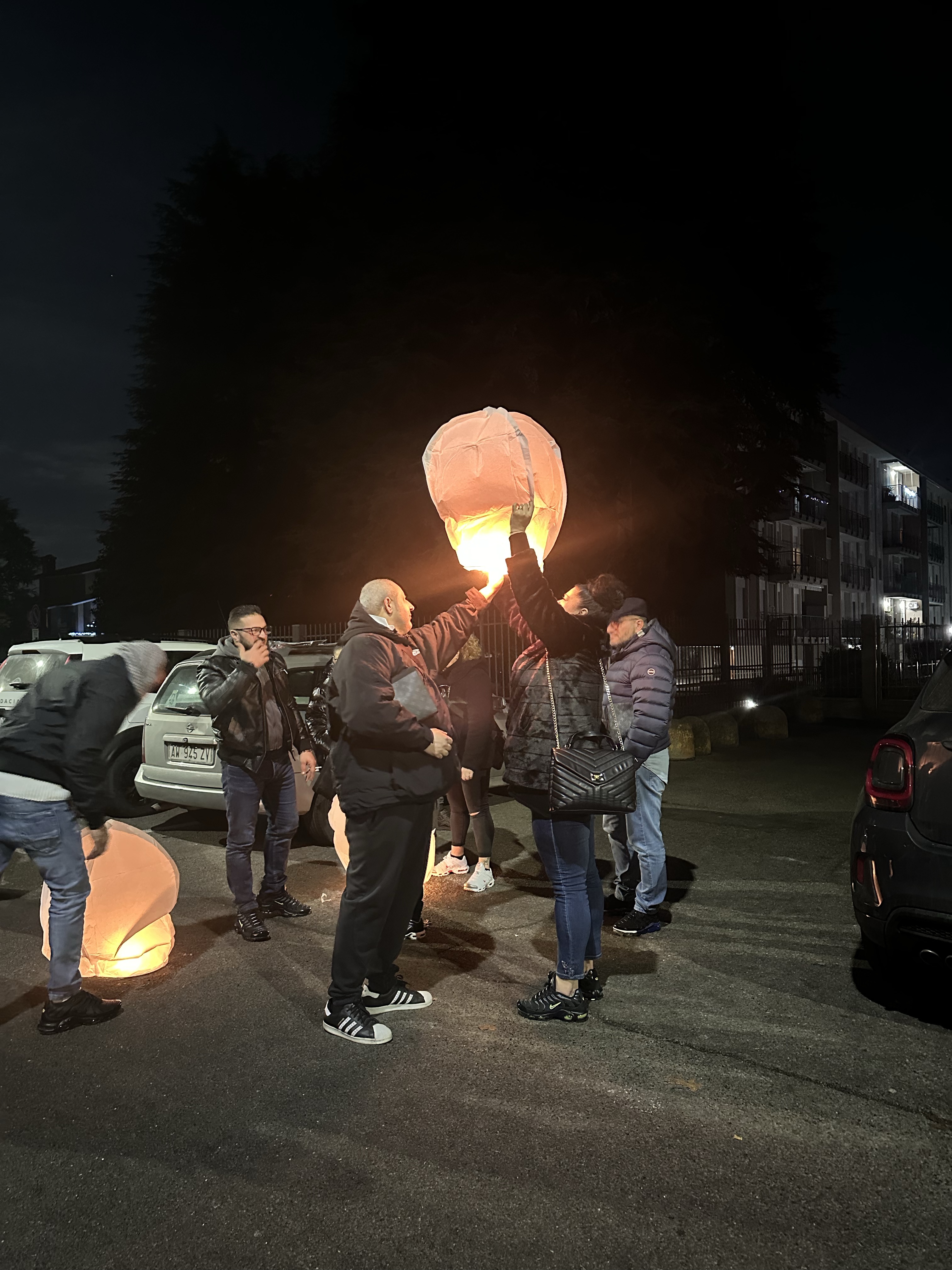 Dopo la messa, abbiamo lanciato i palloncini fuori dalla chiesa e poi, sotto casa, abbiamo acceso due lanterne. Mamma Dany ha voluto farle volare vicino a te, quindi sotto casa a Nova. Beh, mi sa che lo scherzetto ce lo hai fatto tu perchè le lanterne sono rimaste entrambe sull’albero di fronte a casa. E ancora una volta, abbiamo riso pensando a Te, pensando che sia stata tu a volere così. ??