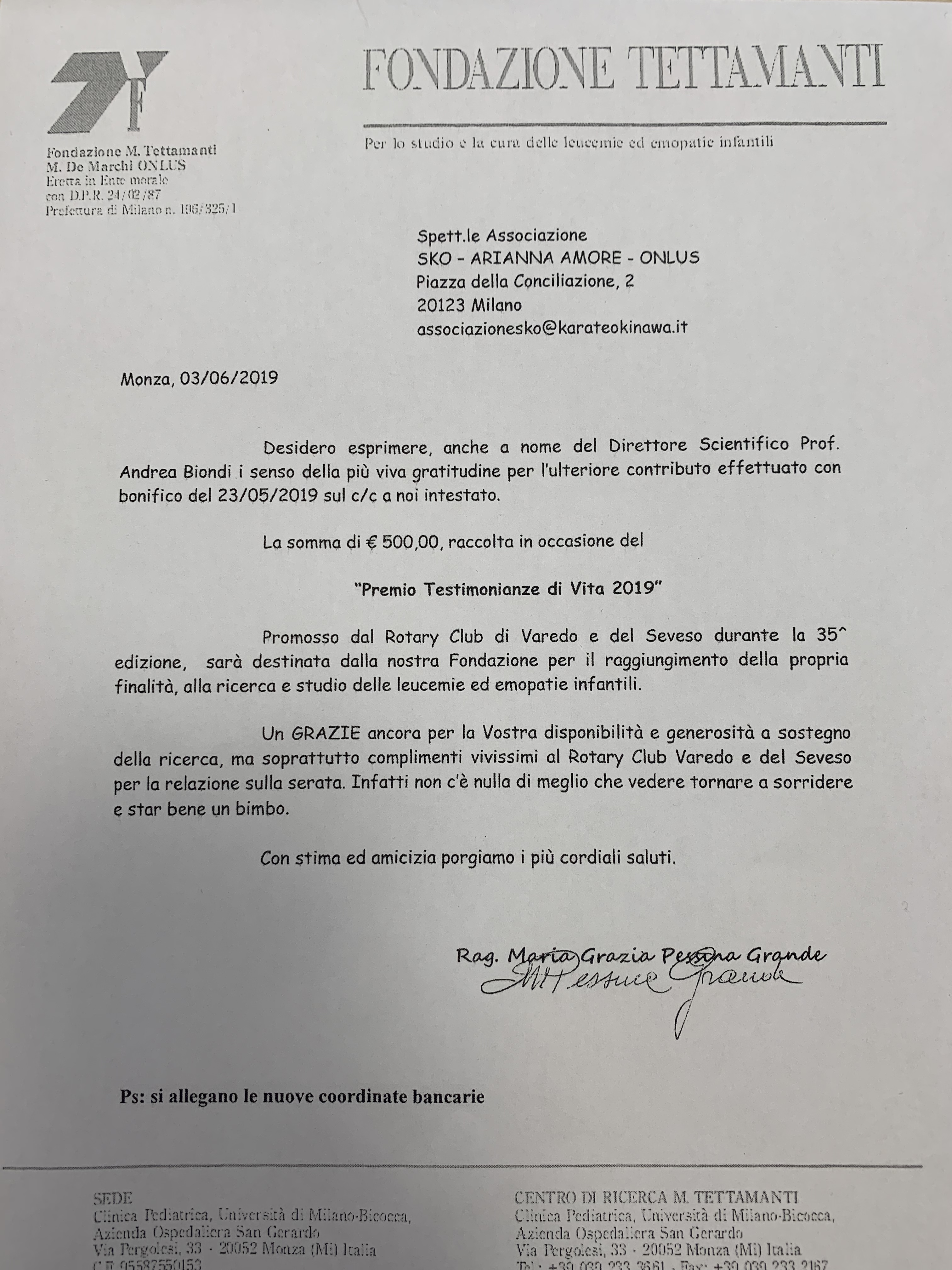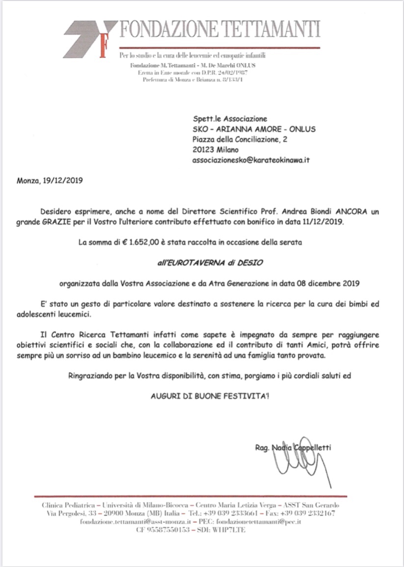 Grazie a questa serata, al netto dei costi di realizzazione dell’evento, abbiamo potuto donare Euro 1652 alla Fondazione Tettamanti di Monza. Sono 1652 passi in più verso risultati ancora migliori di quelli eccezionali finora ottenuti. La ricerca ha bisogno di noi e noi ci siamo e ci saremo sempre!