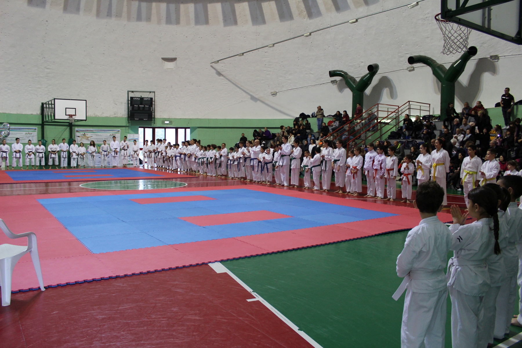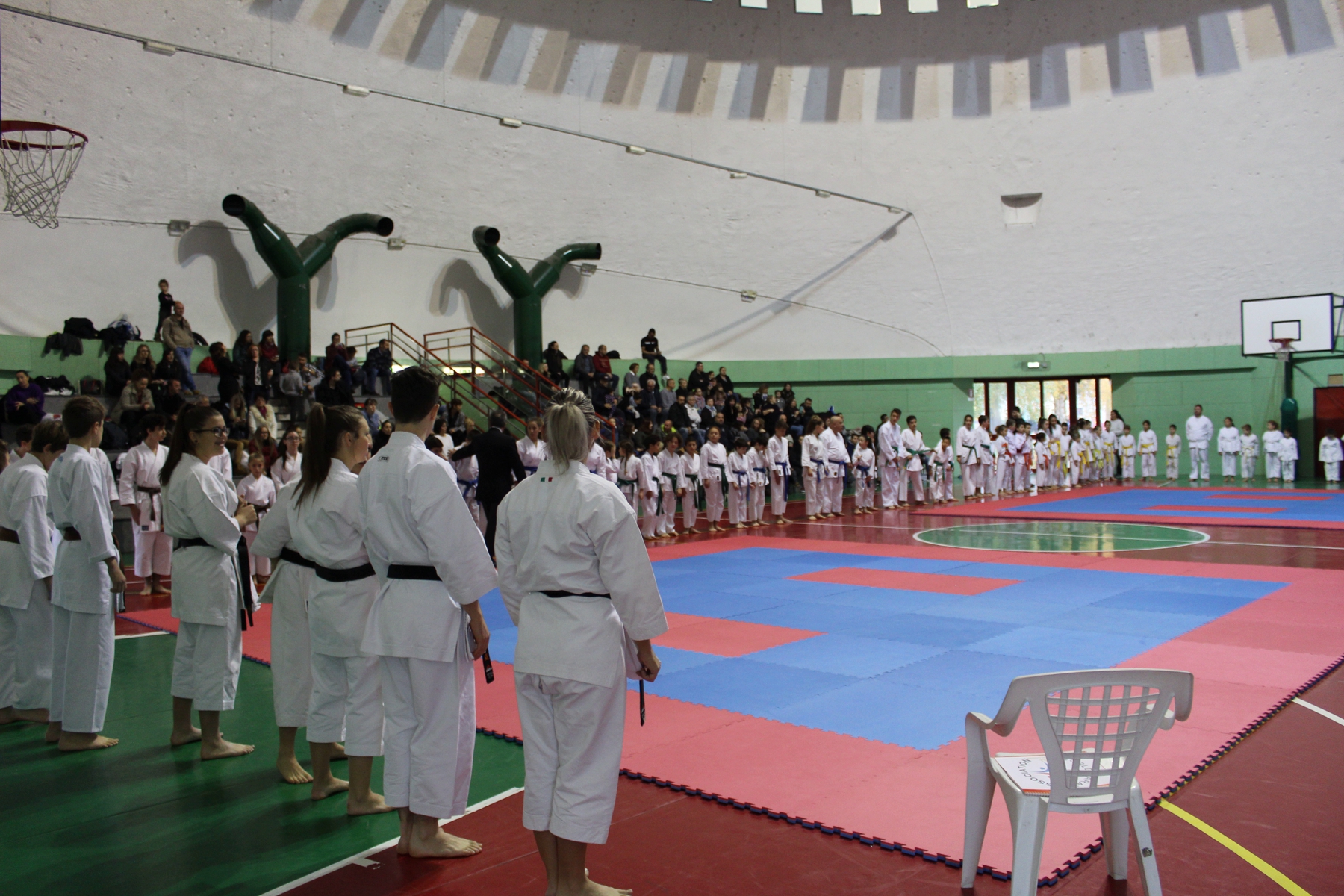 Allievi di tutte le età e cinture, dalle bianche alle colorate fino alle nere. Alcune di queste indossate da campionesse mondiali di Karate.